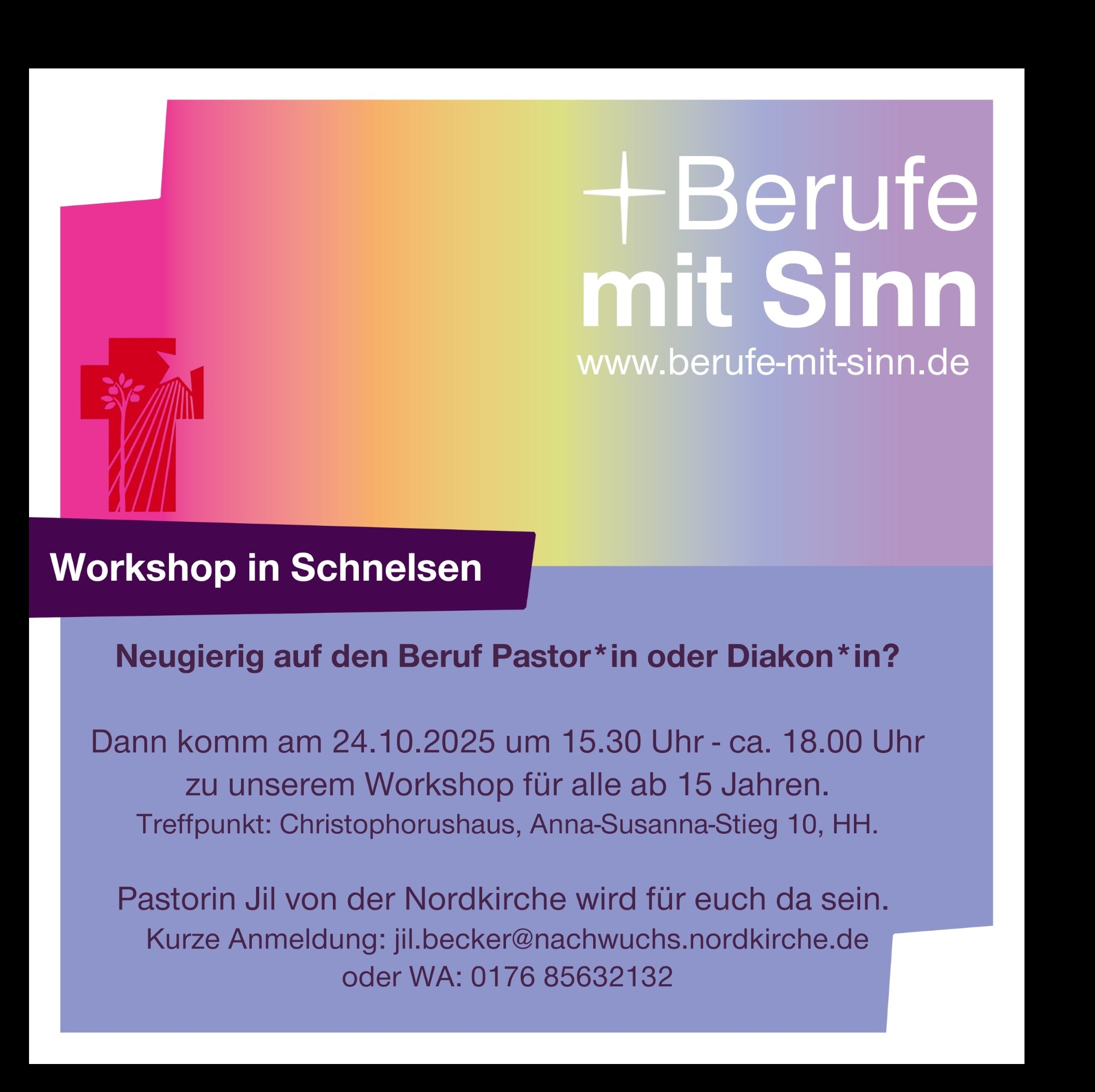 "Wie wird mal eigentlich Pastor*in? Was muss man als Diakon*in können? Wie lange dauert das?" - Am 24. Oktober könnt ihr diese und viele weitere Fragen stellen. Pastorin Jil Becker aus der Nordkirche bietet euch einen Workshop an, bei dem ihr in die Berufe reinschnuppern könnt: Am 24. Oktober, 15:30 Uhr - ca. 18:00 Uhr im Christophorushaus.