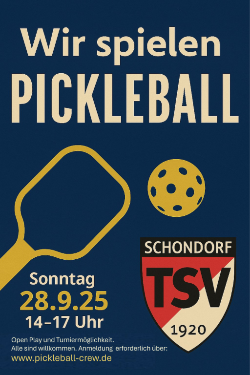 - Eine Anmeldung unter www.pickleball-crew.com ist erforderlich. Das Startgeld beträgt 25€, für TSV-Mitglieder 10€. Schläger vorhanden.