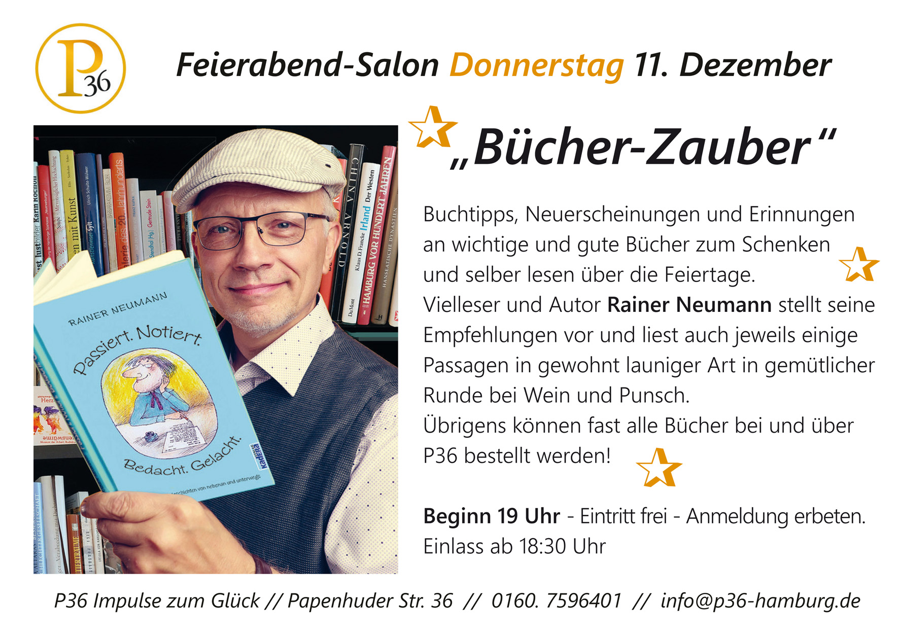 Vielleser und Autor Rainer Neumann stellt seine Empfehlungen vor und liest jeweils einige Passagen in gewohnt launiger Art in gemütlicher Runde bei Wein und Punsch. Die eine und andere Anekdote über Begegnungen und Freundschaften zu Schriftstellerinnen und Schriftsteller wird nicht fehlen.