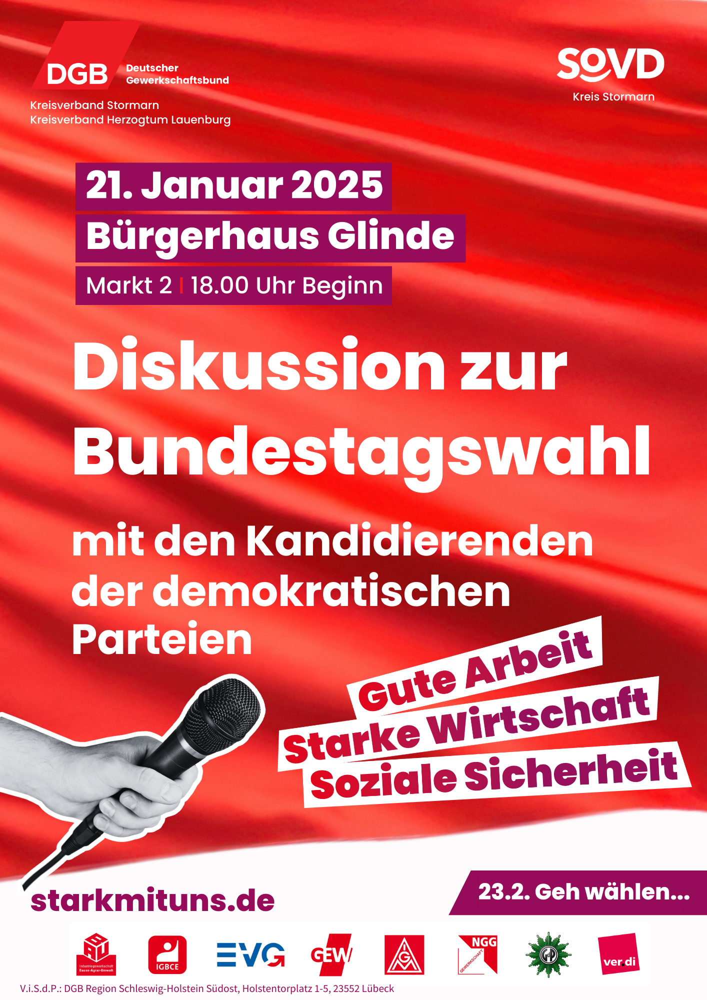 Wir wollen in einer Podiumsdiskussion mit den demokratischen Kandidat*innen der Bundestagsparteien ins Gespräch kommen und mit ihnen insbesondere Fragen diskutieren, die für Arbeitnehmende, Arbeitsuchende sowie Ruheständler*innen von Bedeutung sind.