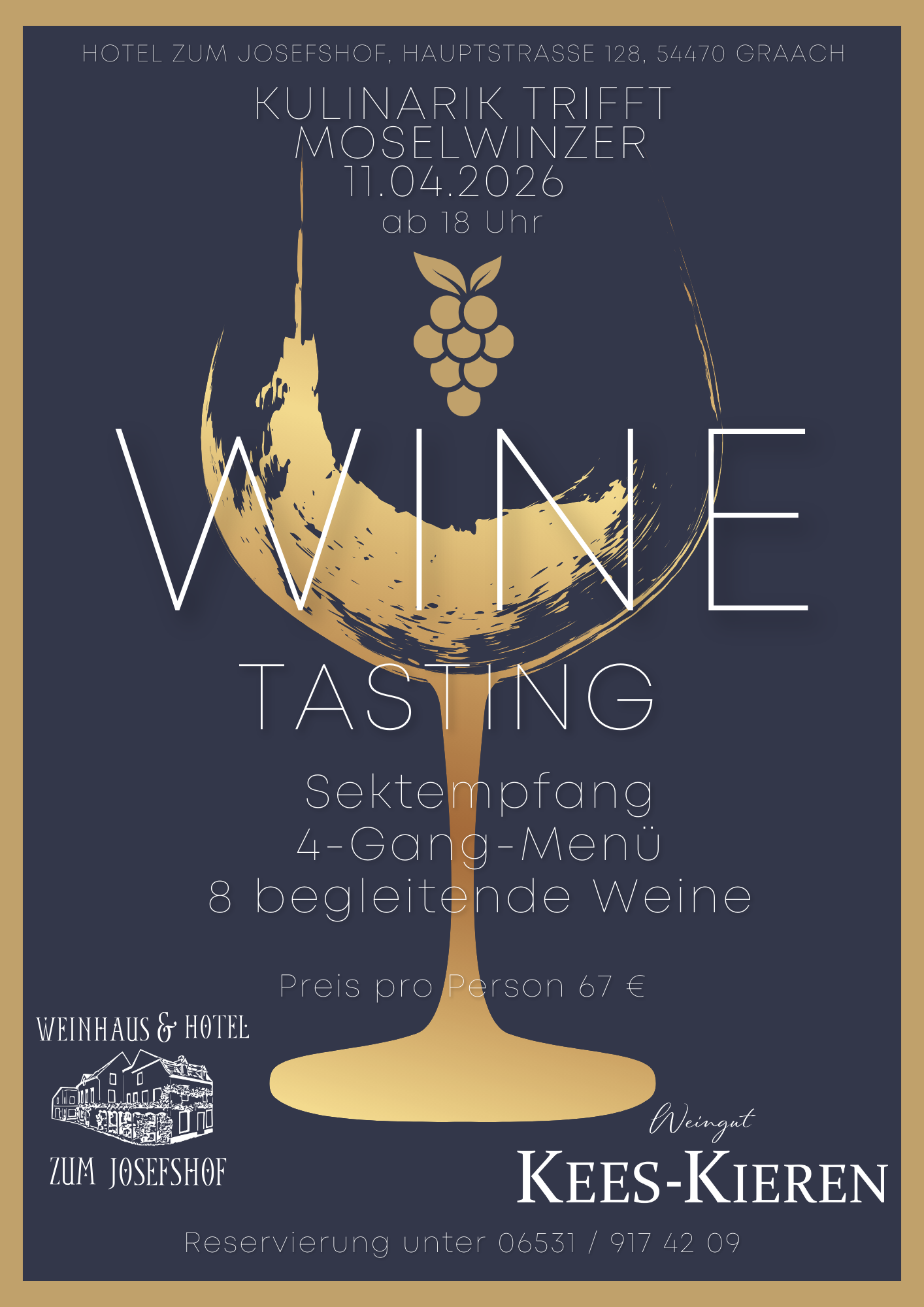 Genussabend mit Sektempfang, 4-Gang-Menü und 8 Moselweinen vom Weingut Kees-Kieren im Weinhaus & Hotel Zum Josefshof.