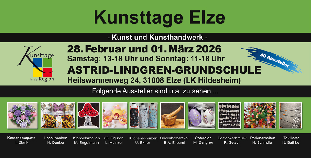 Am 28. Februar und 1. März 2026 finden die 16. Kunsttage in Elze statt. In der Astrid-Lindgren-Grundschule zeigen rund 50 Künstler handgefertigte Werke. Darunter befinden sich Garten und Dekorationsartikel, farbenfroher Schmuck, Papier- und Holzarbeiten sowie eine Vielzahl von textilen Accessoires. Der Kunsthandwerkermarkt lädt zum Stöbern ein und bietet die Gelegenheit, nicht nur fertige Werke zu bewundern, sondern auch den kreativen Entstehungsprozess live zu erleben.