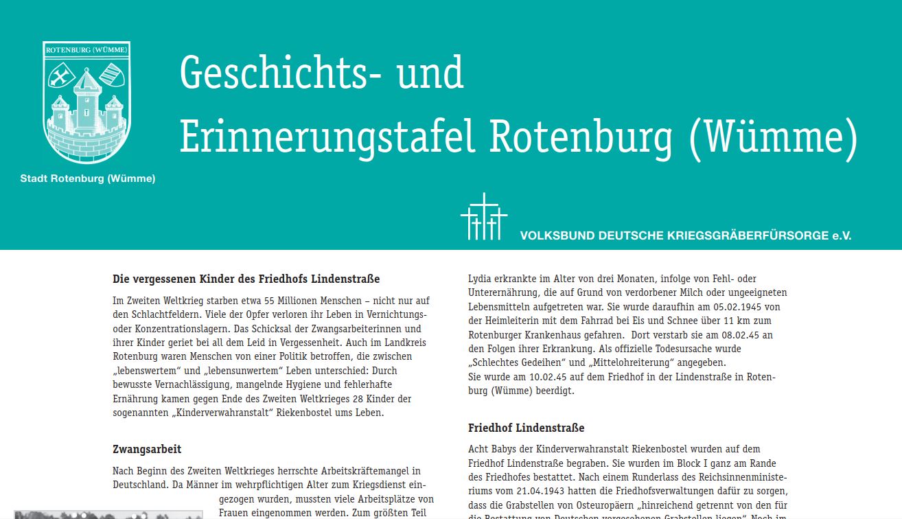 Im Zweiten Weltkrieg starben etwa 55 Millionen Menschen - nicht nur auf den Schlachtfeldern. Viele der Opfer verloren ihr Leben in Vernichtungs- oder Konzentrationslagern. Das Schicksal der Zwangsarbeiterinnen und ihrer Kinder geriet bei all dem Leid in Vergessenheit. Auch im Landkreis Rotenburg waren Menschen von einer Politik betroffen, die zwischen "lebenswertem" und "lebensunwertem" Leben unterschied: Durch bewusste Vernachlässigung, mangelnde Hygiene und fehlerhafte Ernährung kamen gegen Ende des Zweiten Weltkrieges 28 Kinder der sogenannten "Kinderverwahranstalt" Riekenbostel ums Leben. Acht Babys der Kinderverwahranstalt Riekenbostel wurden auf dem Friedhof Lindenstraße begraben. Sie wurden im Block I ganz am Rande des Friedhofes bestattet. Nach einem Runderlass des Reichsinnenministeriums vom 21.04.1943 hatten die Friedhofsverwaltungen dafür zu sorgen, dass die Grabstellen von Osteuropäern "hinreichend getrennt von den für die Bestattung von Deutschen vorgesehenen Grabstellen liegen". Noch im Ort der Bestattungen widerspiegelte sich so die NS-Rassenideologie.