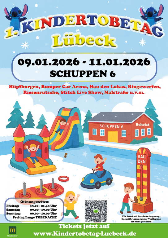 Erstmalig in Lübeck eröffnet der Kindertobetag vom 09. bis 11. Januar 2026 im Schuppen 6 - ein echtes Winter Paradies für kleine Abenteurer. Drei Tage voller Spiel, Spaß und Bewegung warten auf euch. Neben vielen Hüpfburgen, Riesenrutsche, Ringewerfen und der Stitch Live Show gibt es noch viele weitere Attraktionen für Kinder jeden Alters.
