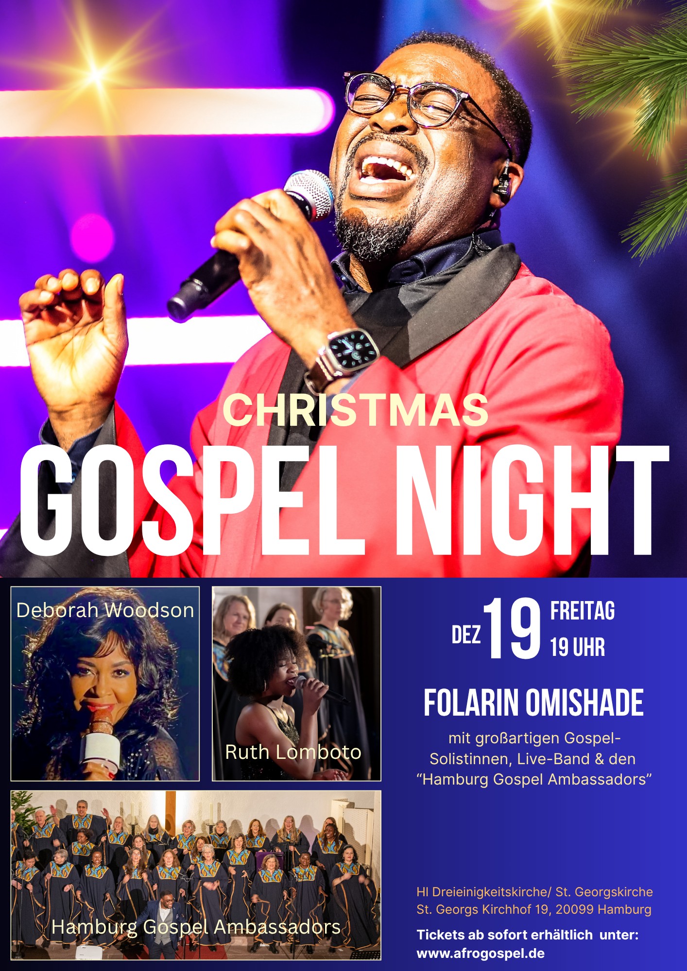 Gospelzauber für’s Herz!Am 19.12.25 ist es endlich wieder soweit – die Christmas Gospel Night steht vor der Tür, und wir können es kaum erwarten, diesen ganz besonderen Abend gemeinsam mit Euch zu feiern!Freut Euch – wie jedes Jahr – auf einen einmaligen und mitreißenden Konzertabend, der glanzvoll, magisch und bunt ist und Euch Weihnachten direkt ins Herz tragen wird.Es erwartet Euch eine schillernde Mischung aus gefühlvollen und mitreißenden Gospel-Weihnachtsklassikern sowie multikulturellen Christmas-Songs, die von unseren großartigen Solistinnen und Solisten zum Leben erweckt werden.Dieses Jahr dürfen wir uns auf Deborah Woodson als Special Guest freuen!Deborah ist ein internationaler Gospelstar, der auf den größten Bühnen der Welt, darunter der Broadway, gesungen hat. Sie hat viele prominente Künstler begleitet, darunter Jennifer Rush, Gloria Gaynor, die Weather Girls und die Scorpions. Ihre unverwechselbare Stimme wird den Abend zu einem unvergesslichen Erlebnis machen!Neben Deborah Woodson dürfen wir auch Ruth Lomboto und Folarin Omishade begrüßen, die mit ihren kraftvollen Stimmen den Abend noch bereichern werden. Ruth wird mit ihrer beeindruckenden Energie und Folarin mit seiner einzigartigen Mischung aus Soul, Power und Gefühl für Gänsehautmomente sorgen.Unser großartiger und stimmgewaltiger Gospelchor, die Hamburg Gospel Ambassadors, sowie unsere brillante Live-Band werden Euch ebenfalls durch den Abend begleiten und diesem Event ihren ganz besonderen Glanz verleihen. Ein weiteres Highlight: In diesem Jahr feiern wir unseren Weihnachtszauber in der wunderschönen Hl. Dreieinigkeitskirche/St. Georgskirche in Hamburg.Diese beeindruckende Kirche besticht nicht nur durch ihre hervorragende Architektur, sondern auch durch ihre ausgezeichnete Akustik, die das Konzert zu einem einzigartigen Erlebnis machen wird.Wir freuen uns sehr darauf, diesen Weihnachtszauber zusammen mit Euch zu erleben und gemeinsam einen unvergesslichen Abend zu feiern!********************TICKETS und weitere Infos:https://shop.snapticket.de/.../christmas-gospel-night-25...Normalpreis 20,- EURO zzgl. VorverkaufsgebührErmäßigt*: 17,- EURO zzgl. Vorverkaufsgebühr (* für Schüler, Studenten & Personen mit Behinderung. Bitte bringen Sie einen entsprechenden Nachweis für Ihr ermäßigtes Ticket mit.)Bitte beachten: es herrscht freie Platzwahl bei diesem Konzert.Abendkasse ab 18:15 Uhr: Ticketpreise: 25,- €/ 23,- € ermäßigt.Einlass: ab 18.15 Uhr/ Start: 19 UhrOrt: Hl. Dreieinigkeits-Kirche St. Georg, St. Georgs Kirchhof 3, 20099 HamburgNoch Fragen? Schreibt uns gerne ein Mail an: office@afrogospel.de
