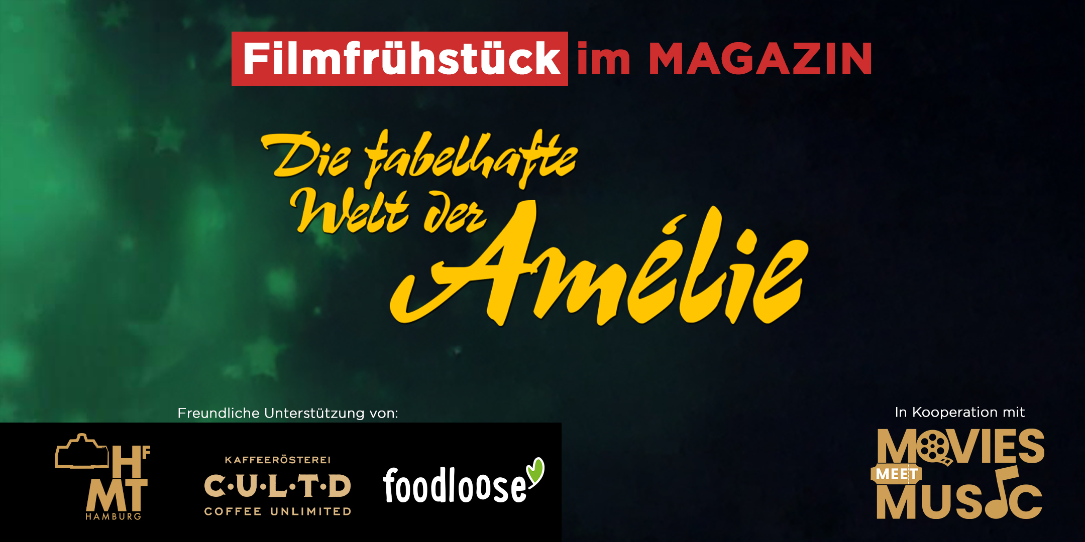 Ein Sonntagmorgen für alle Sinne: Beim Filmfrühstück im MAGAZIN zeigen wir den charmanten Klassiker "Die fabelhafte Welt der Amelie". In Kooperation mit der Filmreihe "Movies meet Music" von der Hochschule für Musik & Theater Hamburg. Schnappt euch einen leckeren Kaffee und genießt die Filmeinführung von Filmkritiker Christoph Dobbitsch. Inspiriert von der poetischen Atmosphäre in Amelies Welt hat Elena Khurgina ein musikalisches Vorprogramm kuratiert und die die Künstlerin Alessandra Pero (Favolizie Illustrations) präsentiert ihre Werke im Foyer.