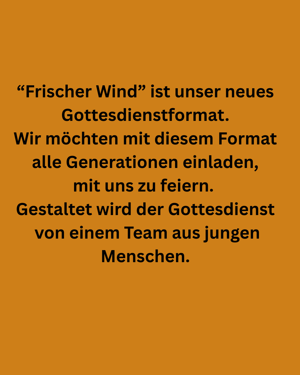 „Frischer Wind“ – Gottesdienst für alle GenerationenWas macht dieses Format so besonders? Am Eingang stehen Getränke, die gerne mit in den Gottesdienst genommen werden können. Kurz vor Beginn wird es einen Count-Down geben, der bedeutet, dass sich langsam alle einen Platz suchen sollten und wir gleich starten. Wir freuen uns, wenn ihr schon früher da seid, um circa 15 Minuten vor Beginn die Lieder anzusingen. Ab 2026 werden wir Gäste für einzelne Themen einladen.Im Anschluss gibt es ein gemeinsames Abendessen / Abendbrot. Wir möchten mit diesem Format alle Generationen einladen, mit uns zu feiern. Gestaltet wird der Gottesdienst von einem Team aus jungen Menschen.Wir freuen uns, wenn ihr dabei seid.Euer Vorbereitungsteam