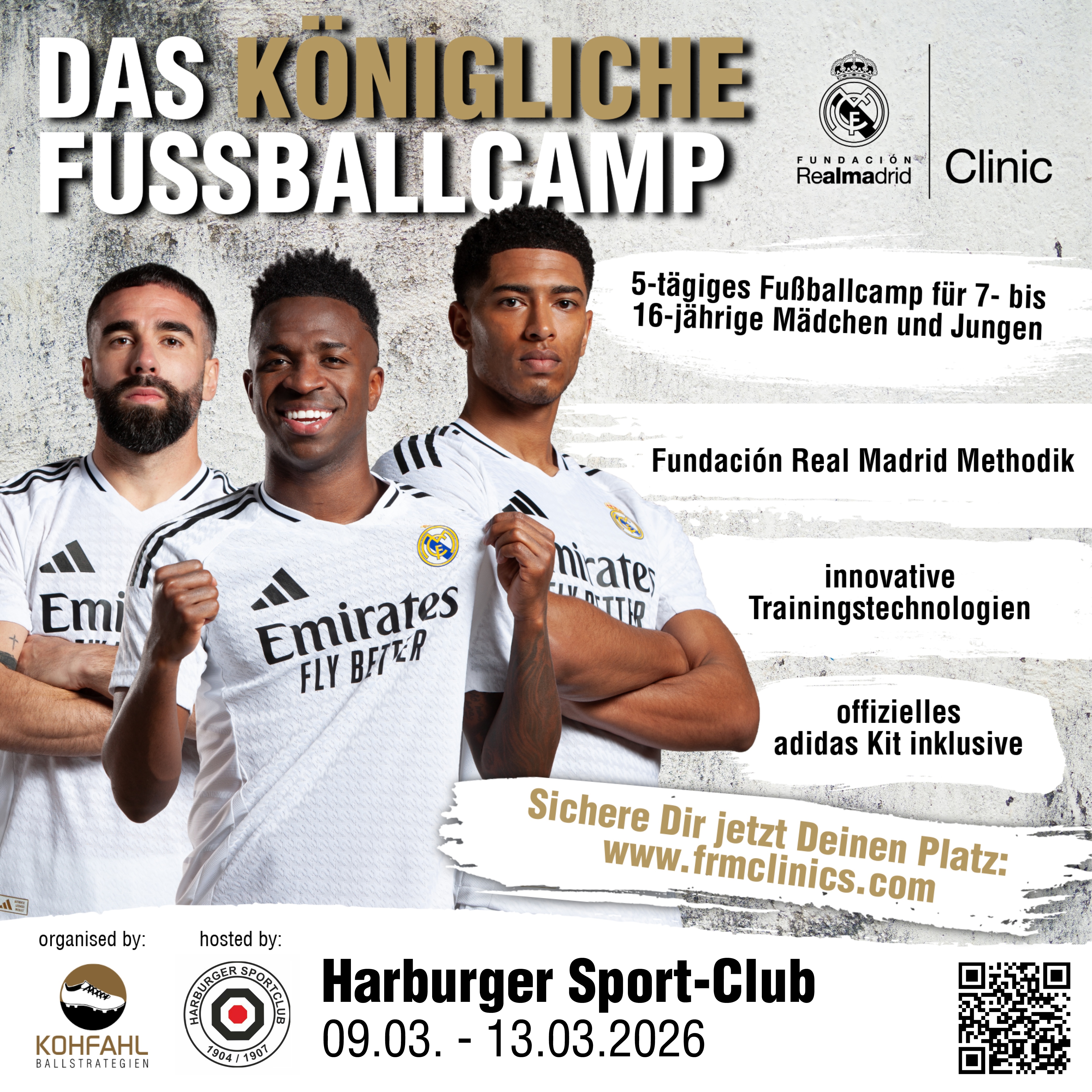 Das Fundacion Real Madrid Fußballcamp, organisiert von Kohfahl Ballstrategien, kommt vom 09.03. bis 13.03.2026 zum Harburger Sport-Club.