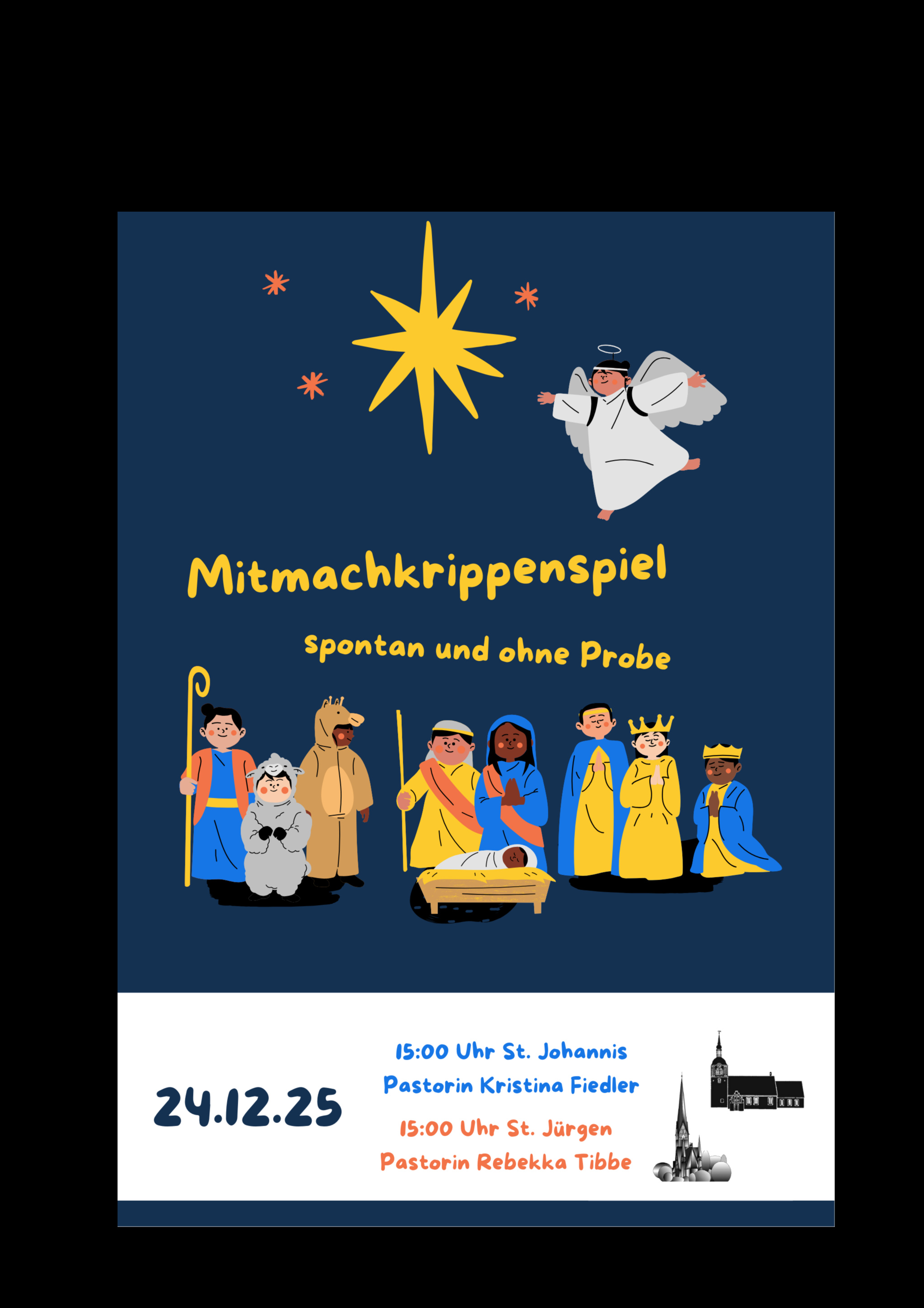 Auch in diesem Jahr gibt es die Neuauflage des ganz besonderen Krippenspiels. Was ist das Besondere daran? Es gibt vorher keine Proben! Wir spielen das Krippenspiel zusammen mit denen, die da sind. So spontan und improvisiert wie eine Geburt im Stall bei Ochs und Esel und so wunderbar wie die Ankunft von Jesus, dem Sohn Gottes, auf Erden soll es werden. Ihr müsst nichts auswendig lernen oder mitbringen außer euch selbst und am besten noch ein paar Verwandte oder Freund:innen. Wir freuen uns darauf, es mit euch Weihnachten werden zu lassen!