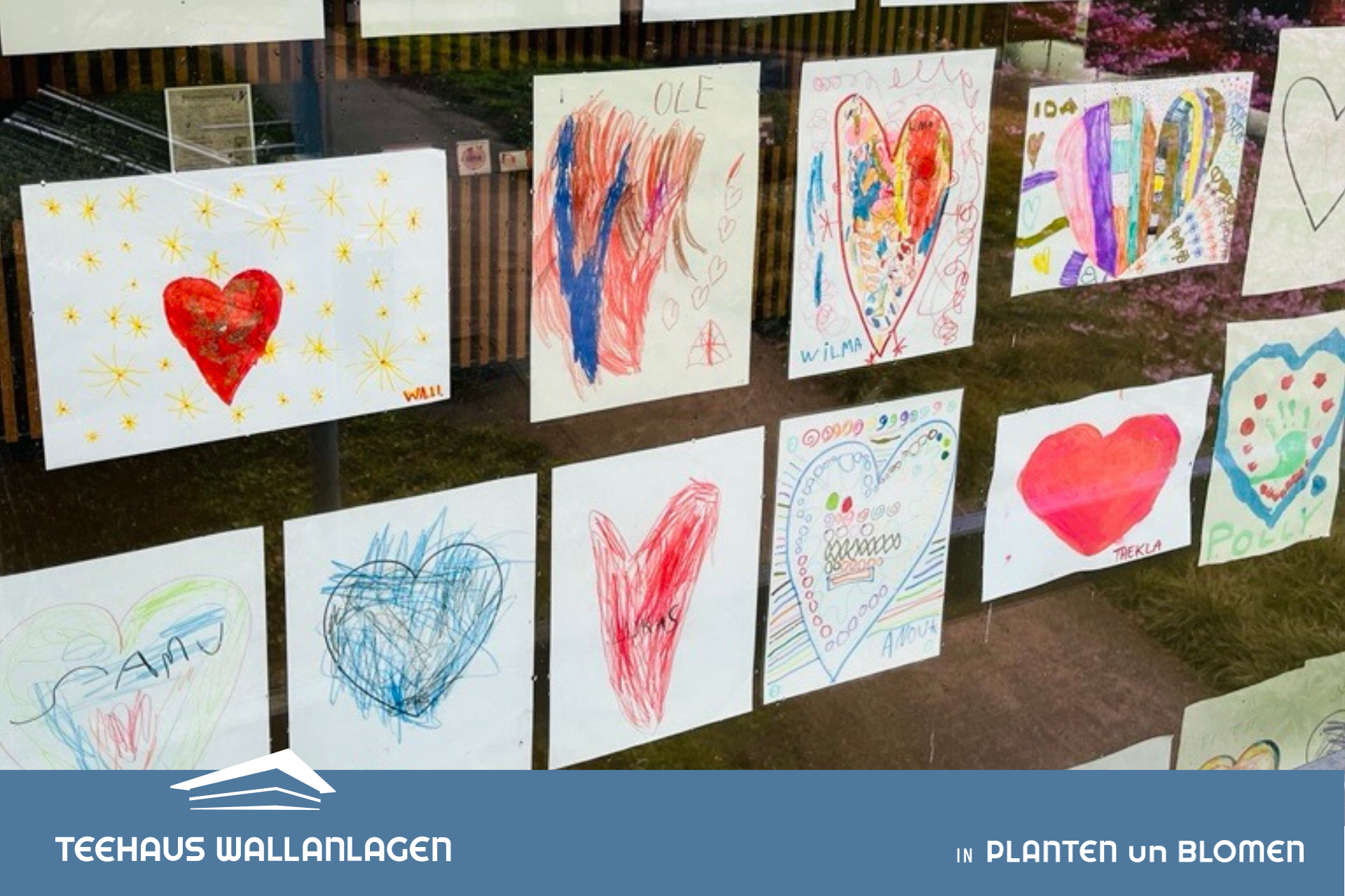 Alle eingesendeten Kunstwerke sind ab sofort im Teepavillon in Planten un Blomen zu sehen. Dank Unterstützung des Hamburger Künstlers Jan Helbig schmücken die Herzen bis Ende April die riesigen Fensterfronten.