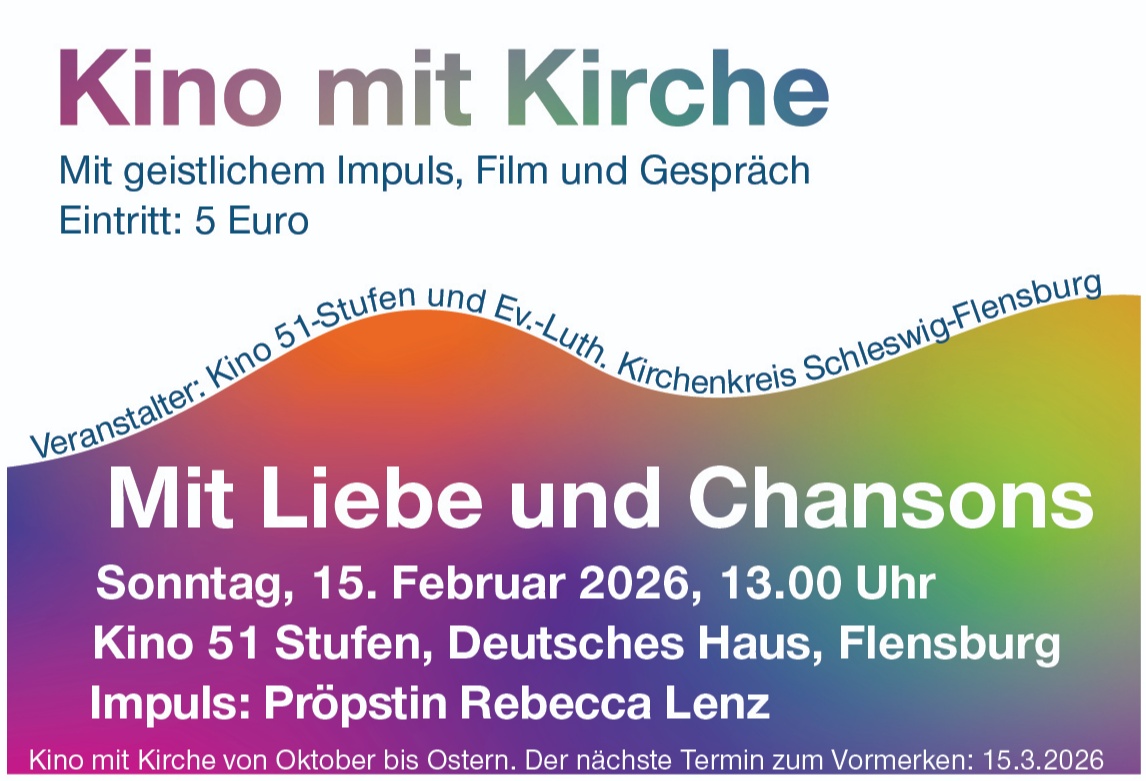 Kino mit Kirche zeigt: "Mit Liebe und Chansons"Den geistlichen Impuls zum Film gibt Pröpstin Rebecca Lenz.Die Veranstaltung beginnt am Sonntag, 15.02.2026 um 13 Uhr im Flensburger 51-Stufen-Kino im Deutschen Haus. Der Eintritt beträgt 5,00 Euro.