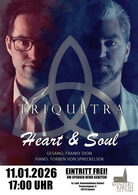 Herzlich Willkommen bei „Triquetra“ – Ein musikalisches Duo für Gefühl und Seele. Lassen Sie sich entführen in die Welt der schönsten Balladen und Liebeslieder mit „Heart & Soul“, dem einzigartigen Programm des Musikduos Triquetra. Torben von Spreckelsen – ein erstklassig ausgebildeter Pianist – und der sympathische Entertainer Franky Dion, dessen charismatische Stimme tief ins Herz trifft, haben sich hier einen langgehegten Traum erfüllt: die Kraft der Musik mit der Leidenschaft der Emotionen zu vereinen. In ihrem Programm präsentieren die beiden Musiker ein facettenreiches Repertoire aus den ikonischsten Songs der Musikgeschichte. Lassen Sie sich von den herzergreifenden Melodien und Texten von Künstlern wie unter anderen Ronan Keating, ABBA, Bob Dylan, Celine Dion und Elton John verzaubern. Jede Melodie wird mit der nötigen Hingabe und Leidenschaft zum Leben erweckt und spricht direkt die Seele des Zuhörers an.