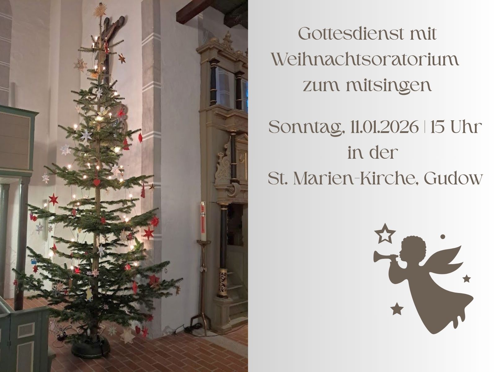 Johann Sebastian Bach:WEIHNACHTSORATORIUMKantaten I+III+VISingende: aus nah & fernEin OrchesterSusanne Bornholdt - LeitungEintritt frei – Spenden willkommenWEIHNACHTSORATORIUM Zum MITSINGENEine Aumühler Weihnachtstradition wandert nach Gudow: das WEIHNACHTSORATORIUM ZUM MITSINGEN. Zum Mitsingen eingeladen sind all jene, die das Werk irgendwann einmal einstudiert haben oder sich im Zuge der Vorbereitung auf diesen Tag intensiv mit der Musik auseinandergesetzt und geübt haben. So wird die reine Musizierfreude an und mit diesem Stück im Vordergrund stehen. Im Orchester werden Jugendliche und Semiprofis unter Anleitung erfahrener Musikerkolleg:innen mitwirken.Wer Interesse am Mitsingen hat, sollte sich per Mail sbornholdt@kirche-ll.de unter Angabe der Stimmgruppe anmelden. Die Anmeldung beinhaltet die verbindliche Teilnahme an folgenden Probenterminen:Sonntag, 4. Januar 12:00 – 17:00 Uhr, Polleyn-Zentrum, Jochim-Polleyn-Platz 9, 23879 Mölln, regionale Chorprobe „Weihnachtsoratorium zum Mitsingen“Samstag, 10. Januar Generalprobe mit Orchester (vorr. bis max 16 Uhr), ebenfalls im Polleyn-ZentrumSonntag, 11. Januar 13:30 Uhr Stell- und Anspielprobe in Gudow15:00 Uhr Konzert WeihnachtsoratoriumHörende unseres Weihnachtsoratoriums finden auf den hinteren Bankreihen Platz und sind sowohl im Kirchenschiff als auch auf der Empore mitten drin im musikalischen Geschehen. Im Anschluss gibt es ein fröhliches Beisammensein für alle beim mitgebrachten Buffet in der Pfarrscheune.Susanne Bornholdt