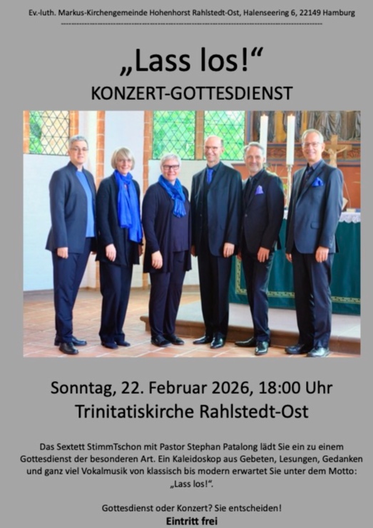 Das Sextett StimmTschon mit Pastor Stephan Patalong lädt Sie ein zu einem Gottesdienst der besonderen Art. Ein Kaleidoskop aus Gebeten, Lesungen, Gedanken und ganz viel Vokalmusik von klassisch bis modern erwartet Sie unter dem Motto: „Lass los!“.Gottesdienst oder Konzert? Sie entscheiden! Eintritt frei