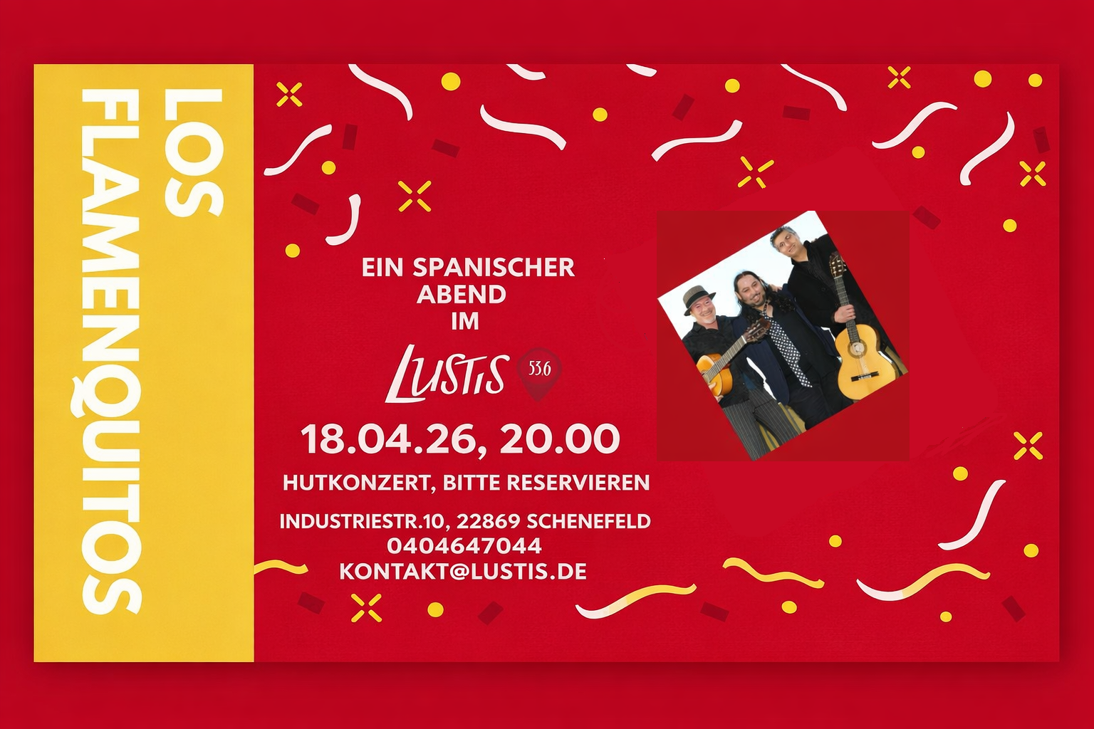 Die renommierte Musikgruppe "Los Flamenquitos" lädt zu einem unvergleichlichen spanischen Abend ein, bei dem die Leidenschaft und Energie des Flamencos und die Lebensfreude der Rumba-Rhythmen zelebriert werden. Das Konzert findet am 18.04.26 im LUSTiS 53,6 statt und verspricht, eine beeindruckende Darbietung spanischer Musik und Tanzkunst zu werden.