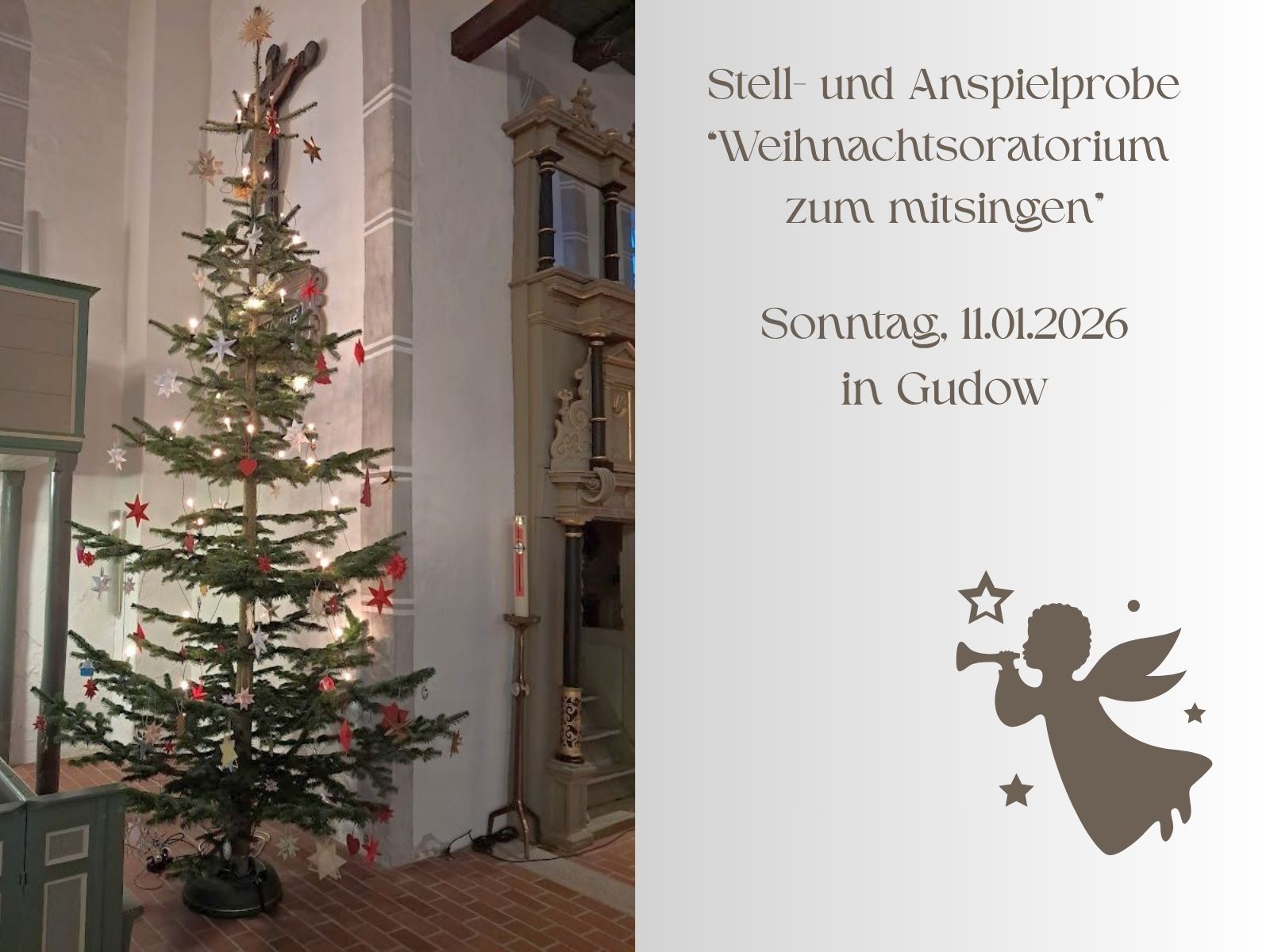 Johann Sebastian Bach:WEIHNACHTSORATORIUMKantaten I+III+VISingende: aus nah & fernEin OrchesterSusanne Bornholdt - LeitungEintritt frei – Spenden willkommenWEIHNACHTSORATORIUM Zum MITSINGENEine Aumühler Weihnachtstradition wandert nach Gudow: das WEIHNACHTSORATORIUM ZUM MITSINGEN. Zum Mitsingen eingeladen sind all jene, die das Werk irgendwann einmal einstudiert haben oder sich im Zuge der Vorbereitung auf diesen Tag intensiv mit der Musik auseinandergesetzt und geübt haben. So wird die reine Musizierfreude an und mit diesem Stück im Vordergrund stehen. Im Orchester werden Jugendliche und Semiprofis unter Anleitung erfahrener Musikerkolleg:innen mitwirken.Wer Interesse am Mitsingen hat, sollte sich per Mail sbornholdt@kirche-ll.de unter Angabe der Stimmgruppe anmelden. Die Anmeldung beinhaltet die verbindliche Teilnahme an folgenden Probenterminen:Sonntag, 4. Januar 12:00 – 17:00 Uhr, Polleyn-Zentrum, Jochim-Polleyn-Platz 9, 23879 Mölln, regionale Chorprobe „Weihnachtsoratorium zum Mitsingen“Samstag, 10. Januar Generalprobe mit Orchester (vorr. bis max 16 Uhr), ebenfalls im Polleyn-ZentrumSonntag, 11. Januar 13:30 Uhr Stell- und Anspielprobe in Gudow15:00 Uhr Gottesdienst mit WeihnachtsoratoriumHörende unseres Weihnachtsoratoriums finden auf den hinteren Bankreihen Platz und sind sowohl im Kirchenschiff als auch auf der Empore mitten drin im musikalischen Geschehen. Im Anschluss gibt es ein fröhliches Beisammensein für alle beim mitgebrachten Buffet in der Pfarrscheune.Susanne Bornholdt