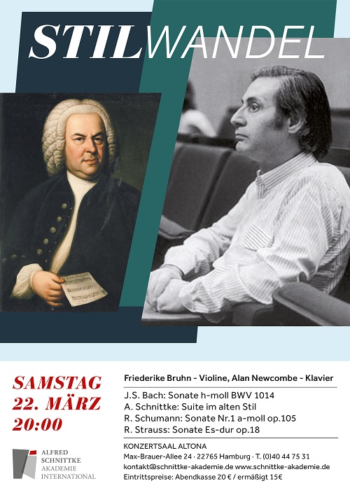 - J.S. Bach: Sonate h-moll BWV 1014 A. Schnittke: Suite im alten Stil R. Schumann: Sonate Nr.1 a-moll op.105 R. Strauss: Sonate Es-dur op.18 Friederike Bruhn - Violine, Alan Newcombe - Klavier