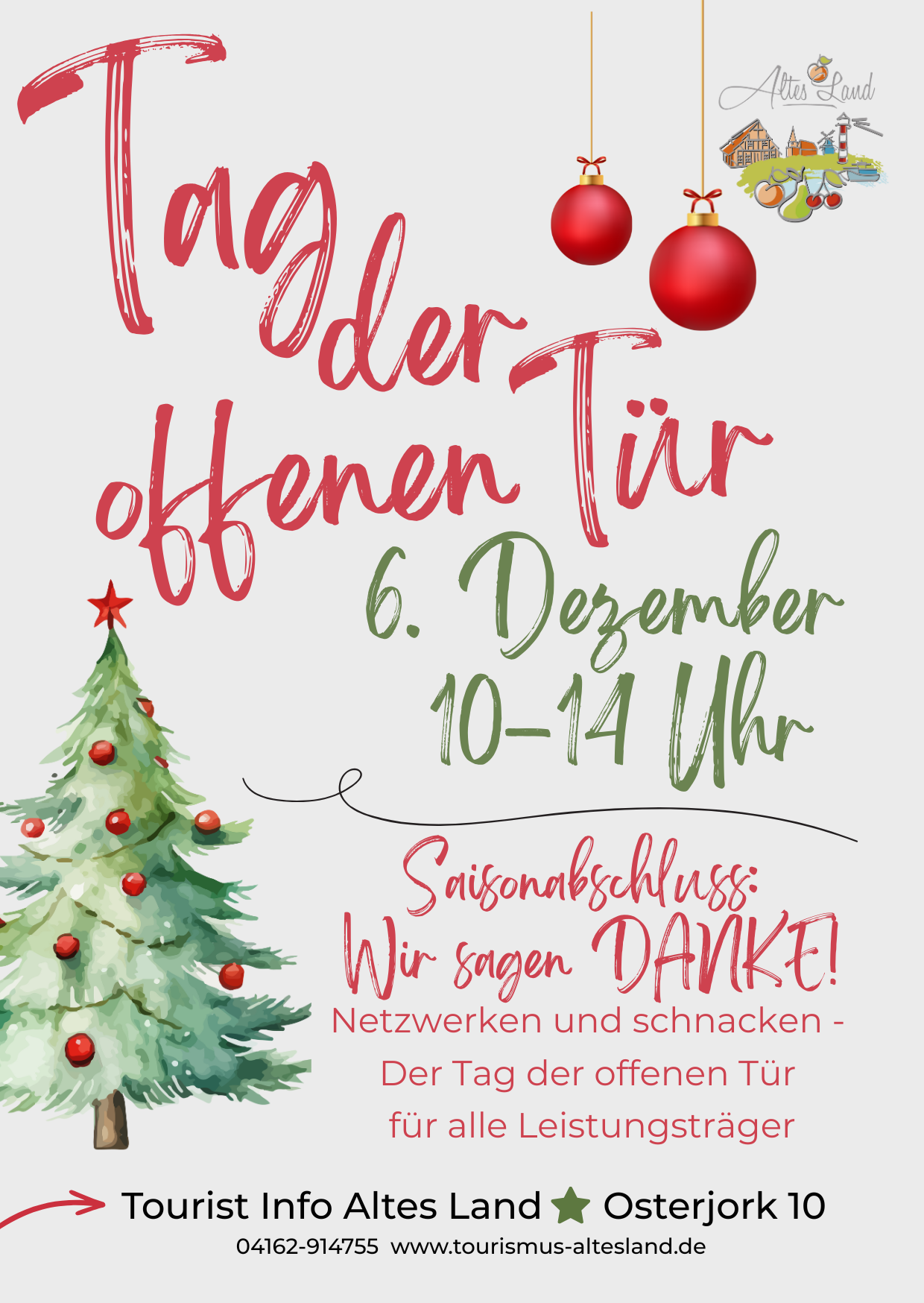- Tag der offenen Tür Saisonabschluss 2025 Die Tourist Information Altes Land sagt Danke! Netzwerken und schnacken - Der Tag der offenen Tür für alle Leistungsträger