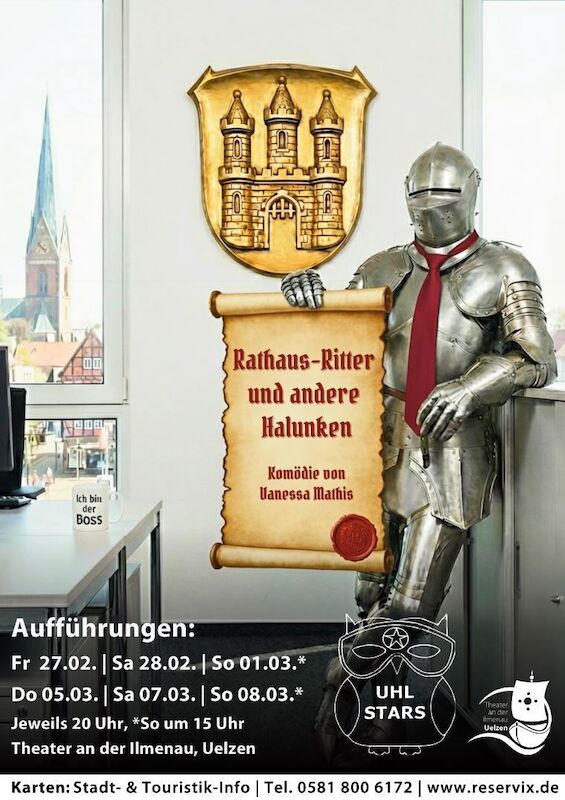 Neue Gullydeckel und ein Faible für Mittelalterfeste bringen Bürgermeister Thorsten König in Bedrängnis. Denn im Rathaus lauern seine Mitarbeiter schon auf den nächsten politischen Fehltritt -und helfen dabei auch gerne nach..."Rathaus-Ritter und andere Halunken" -die neue politische Komödie der "Uhl Stars" von Vanessa Mathis.