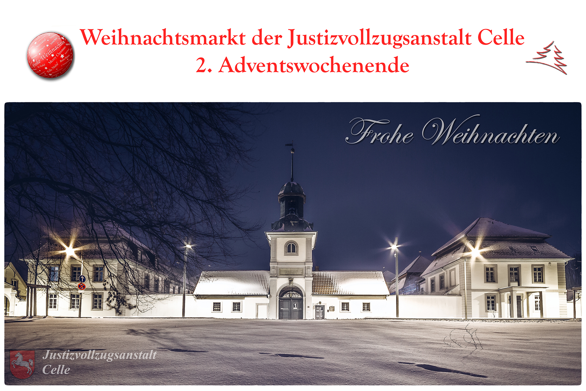 Am zweiten Adventswochenende (06. und 07.12.2025) lädt die JVA Celle zum Weihnachtsmarkt auf dem Anstaltsgelände (Nähe des Kreisels am Bahnhof) ein. Besucherinnen und Besucher sind am Samstag von 12 bis 18 Uhr und am Sonntag von 11 bis 16 Uhr eingeladen, tolle Produkte aus den Arbeitsbetrieben der JVA, Leckeres vom Grill mit Glühwein zu genießen und sich über den Justizvollzug in der JVA Celle zu informieren. Honig vom Bienenprojekt der JVA Celle, Bastelerzeugnisse der örtlichen Anlaufstelle für Straffällige Projekt Brückenbau und Produkte aus Textilien für die Küche sowie Badetücher und Lätzchen für Babys von der JVA für Frauen aus Vechta runden das Verkaufsangebot ab. Eine Tombola bietet in diesem Jahr großartige Gewinnmöglichkeiten. Als besondere Highlights gibt es am 06.12. (16 - 17:30 Uhr) musikalische Unterhaltung vom Blasorchester Salinia und am 07.12. (14:30 -15:30 Uhr) durch den Dudelsackspieler Dirk.
