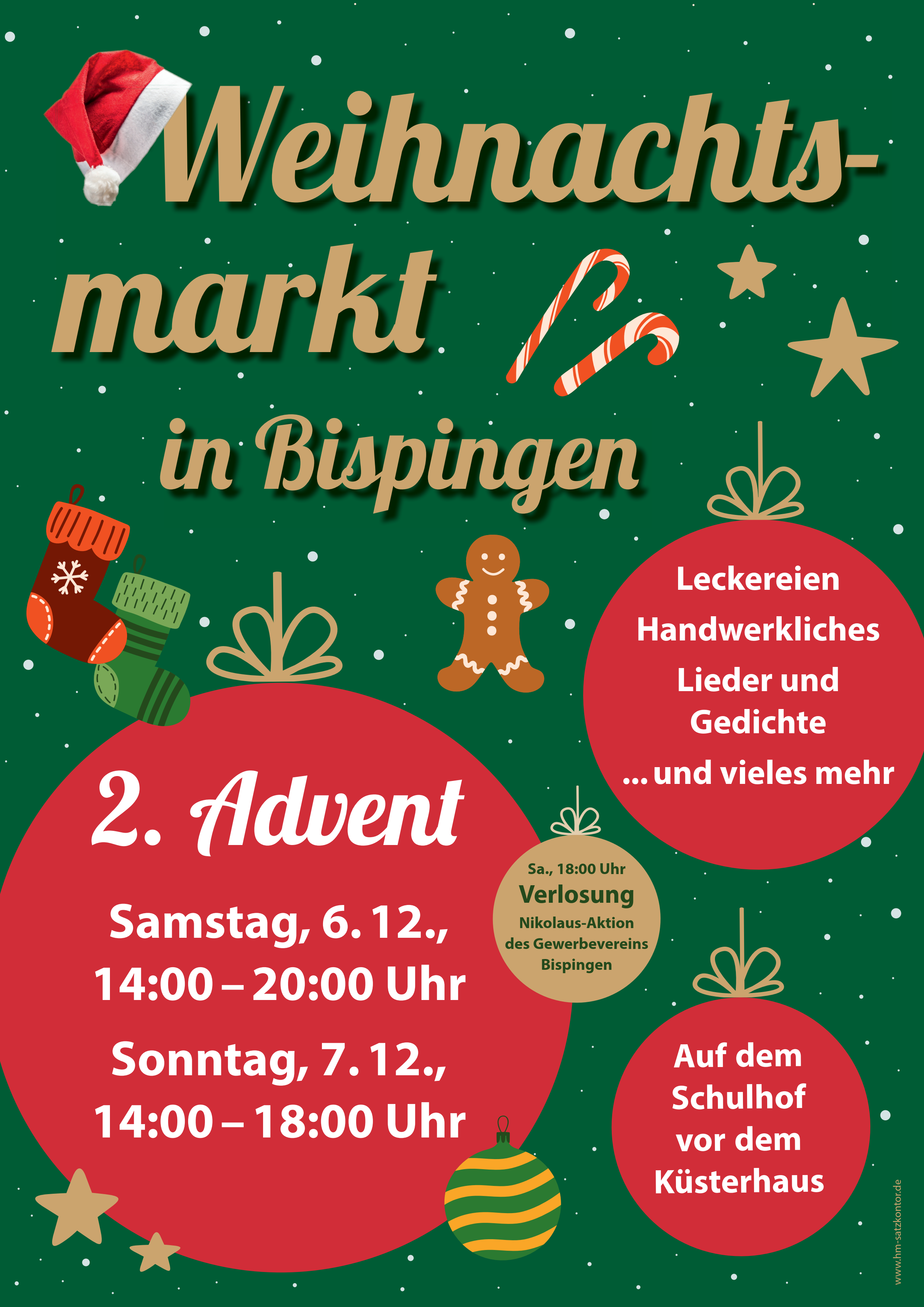 Am 2. Adventswochenende im Herzen von BispingenAm zweiten Adventswochenende verwandelt sich die Grund- und Oberschule Bispingen wieder in eine festliche Weihnachtswelt. Der beliebte Bispinger Weihnachtsmarkt lädt mit seinem besonderen Ambiente rund um die Schule zum gemütlichen Bummeln, Entdecken und Verweilen ein. Organisiert wird der Markt vom Gewerbeverein Bispingen und der Grund- und Oberschule mit Unterstützung der Gemeinde Bispingen. Zahlreiche Kunsthandwerksstände präsentieren ihre Arbeiten und laden zum Stöbern ein. Die Schüler*innen bereichern das weihnachtliche Treiben mit eigenen Aufführungen und Verkaufsständen.Für das leibliche Wohl ist bestens gesorgt: Auf dem Schulhof duftet es nach Bratwurst, Glühwein und vielen weiteren Leckereien. In der Cafeteria bietet der Elternverein Kaffee und Kuchen an.Ein besonderes Highlight ist die Auslosung der Weihnachtsaktion des Gewerbevereins am Samstag um 18 Uhr. Weiterer Höhepunkt ist der Auftritt des Posaunenchores am Sonntag um 16 Uhr. Große und kleine Besucher*innen dürfen sich außerdem auf den Weihnachtsmann freuen, der am Sonntag um 17 Uhr vorbeischaut und für leuchtende Kinderaugen sorgt.kostenlos
