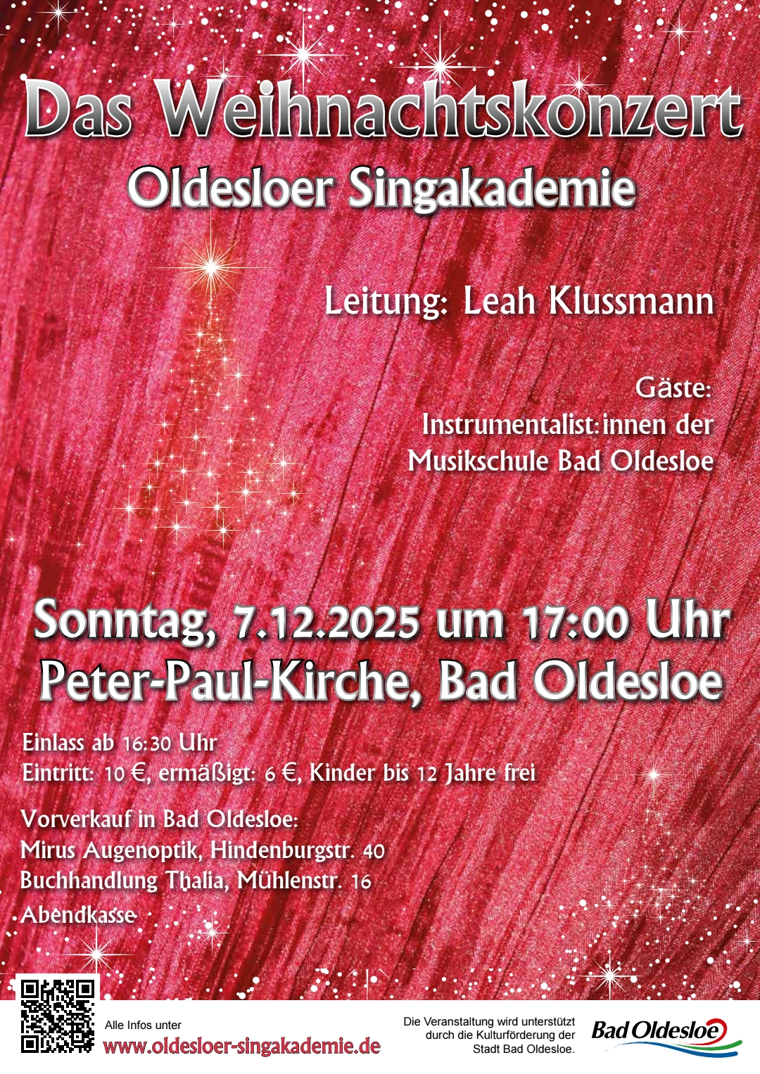 "Das Weihnachtskonzert" der Oldesloer Singakademie. Leitung Leah Klussmann. Wo: Peter-Paul-Kirche zu Bad Oldesloe, Kirchberg 8.
