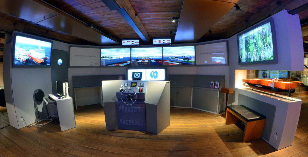 Auf Deck 1 steht unser Schiffsführungssimulator für Sie bereit. Von Stade elbaufwärts sowie in den Häfen Hamburg, Rotterdam und Singapur übernehmen Sie das Kommando. Sie steuern u. a. ein modernes Containerschiff von 335 m Länge, 43 m Breite und ca. 8.750 TEU.