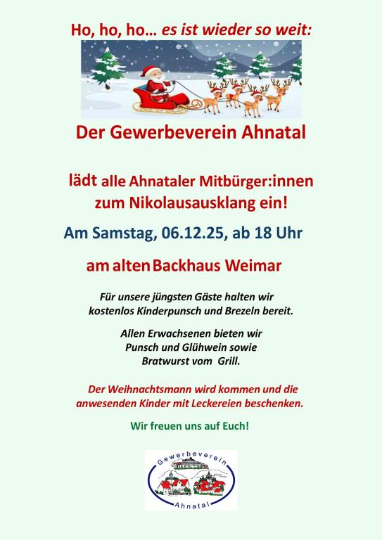 - Der Gewerbeverein Ahnatal lädt alle Ahnataler Mitbürger:innen zum Nikolausausklang ein! Der Weihnachtsmann wird kommen.